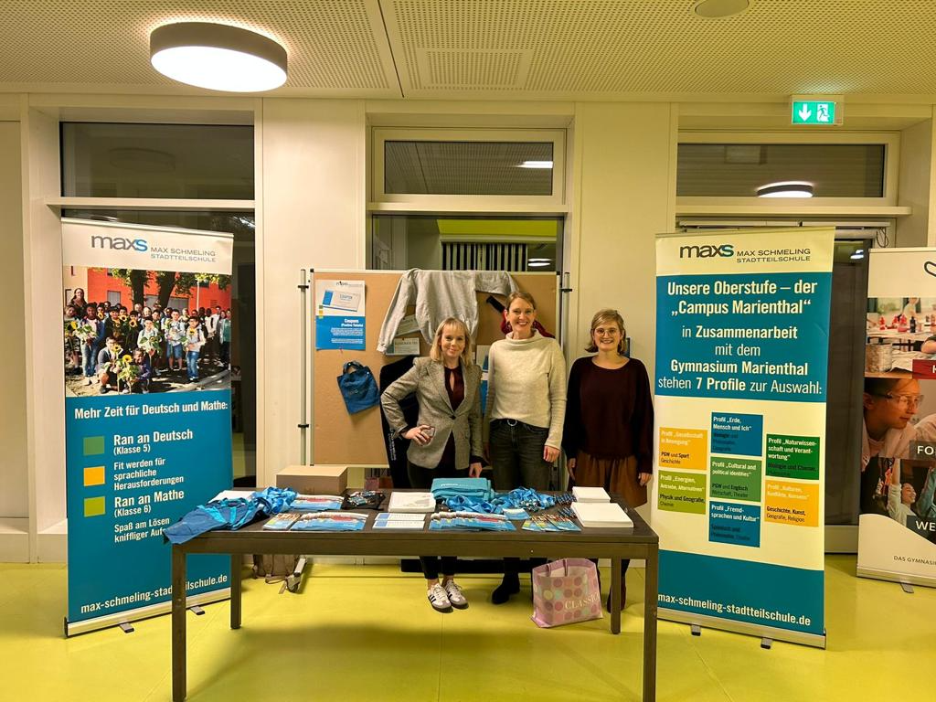 Drei Frauen stehen an einem Informationsstand der Max-Schmeling-Stadtteilschule, flankiert von Roll-Ups mit Informationen zu Schulprogrammen. Auf dem Tisch liegen Flyer und kleine Geschenke aus